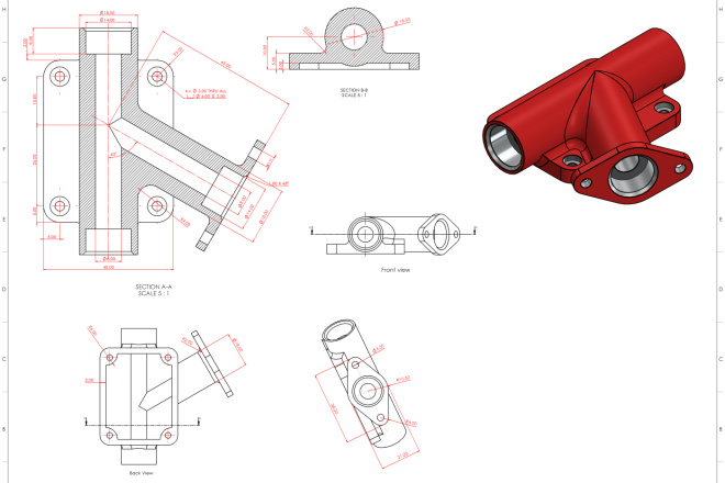 A typical 3D mechanical drawing consists of several essential elements: